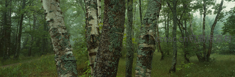 白桦树林中树干斑驳,青苔覆盖其上,薄雾弥漫林间,阳光隐约穿透,营造出幽静神秘的森林氛围,令人流连忘返。