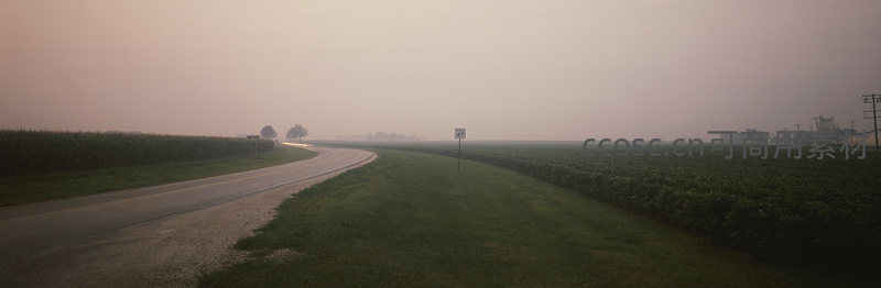 一条蜿蜒的乡间公路穿过被晨雾轻柔包裹的广阔农田,远处隐约可见农舍与电线杆,整个画面弥漫着宁静而诗意的田园气息。