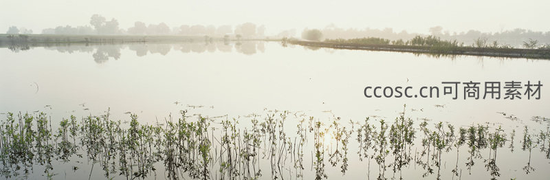 薄雾笼罩的湿地水田与倒影