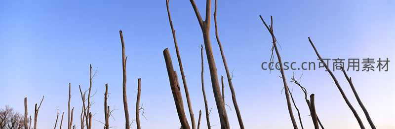 光秃的枯枝向上伸展,剪影般矗立在纯净的蓝天下,展现出一种苍凉、孤寂却充满力量的自然美学意境。