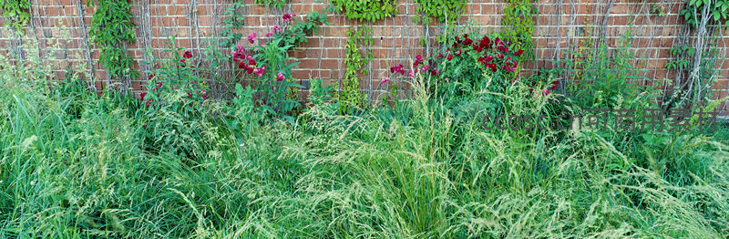红砖墙边绿藤攀爬,深红色玫瑰与野草随风摇曳,展现自然与人工结构和谐共存的庭院生态之美。