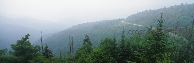 薄雾笼罩的连绵山脉中,一条蜿蜒小路穿行于葱郁林海之间,视野开阔,静谧而富有诗意。