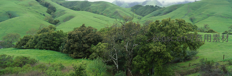 连绵起伏的绿色丘陵如波浪般延展,点缀着浓密树丛与围栏,展现宁静祥和的田园牧歌景象。