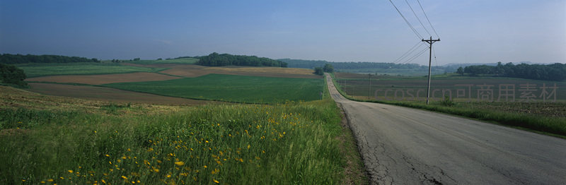 一条笔直乡道延伸至远方,两旁是金黄野花与整齐农田,蓝天白云下尽显质朴宁静的田园生活气息。