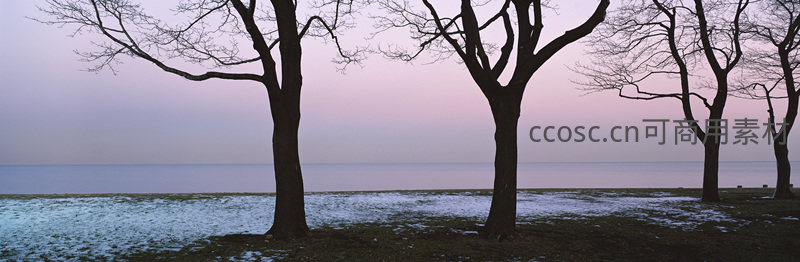 粉紫色晚霞映衬下,几棵光秃的树木伫立湖岸,地面薄雪未融,构成一幅诗意朦胧、充满寂寥美感的黄昏画卷。
