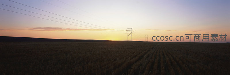 金黄的麦田在夕阳余晖中延伸,远处高耸的输电塔形成优美剪影,展现现代工业与自然田园的和谐共存景象。