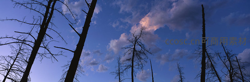 仰拍视角下,光秃的枯树如黑色剪影刺向天空,与绚烂的晚霞和深蓝的云层形成强烈视觉冲击,展现了生命凋零后依然挺立的苍凉美感。