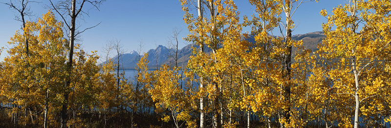 秋季的白杨林披上耀眼的金黄色外衣,在湛蓝天空的映衬下格外夺目。透过摇曳的枝叶,远处的雪山和宁静的湖泊若隐若现,构成一幅色彩斑斓的秋日画卷。
