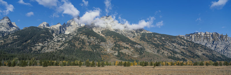 巍峨的山峰被流动的白云环绕,山脚下是金黄与翠绿交织的广阔草原,展现了大自然的雄浑与宁静之美。
