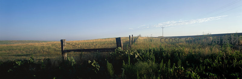 清晨阳光洒在无垠的田野上,一道简陋的木栅栏横亘其间,远处的电线杆和山峦勾勒出宁静的乡村轮廓。