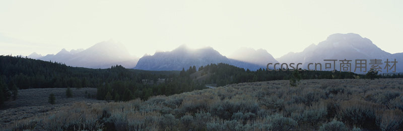 夕阳西下,远山在薄雾中若隐若现,前景是大片灰蓝色的灌木丛,整个画面弥漫着静谧而略带忧郁的氛围。