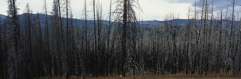 被大火烧毁的森林留下焦黑的树干,背景是连绵起伏的远山,天空阴沉,展现出大自然的破坏与宁静并存的震撼画面。