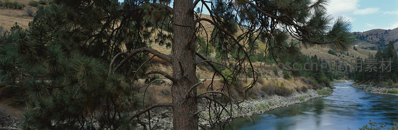 一棵粗壮的松树矗立在前景,枝叶伸展,后方蜿蜒的河流穿过山谷,两岸覆盖着黄绿相间的植被,天空晴朗,充满自然野趣。