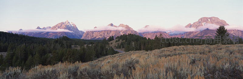 清晨阳光洒在巍峨的雪山上,云雾如纱般缠绕山腰,山脚下是茂密的针叶林和开阔的草原,整个画面宁静而壮美,令人神往。