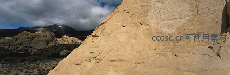 巨大的砂岩斜坡矗立于荒原之上,表面纹理清晰,远处山峦隐现于厚重云层之下,尽显原始野性之美。