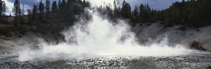 地热蒸汽腾空而起,森林环绕的自然奇观