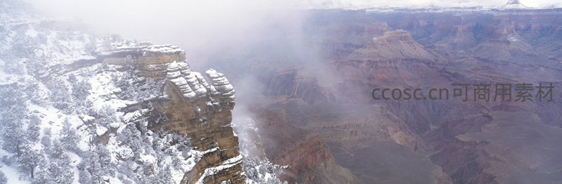 航拍视角下,大峡谷被皑皑白雪覆盖,云雾在谷间缭绕,展现出雄伟而神秘的自然景观,令人叹为观止。
