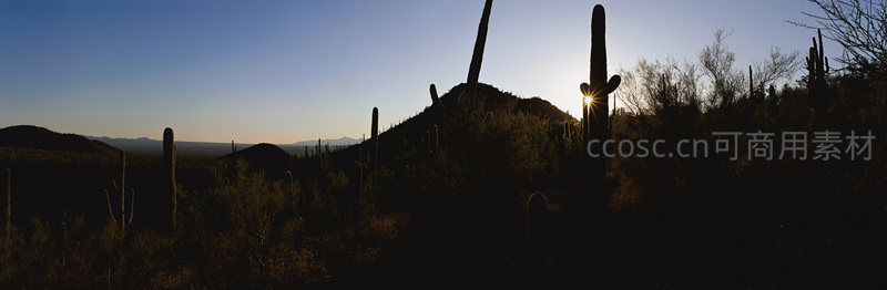 夕阳西下,高大的仙人掌在沙漠中投下深邃剪影,天空渐变色彩映衬着荒漠的宁静与辽阔。