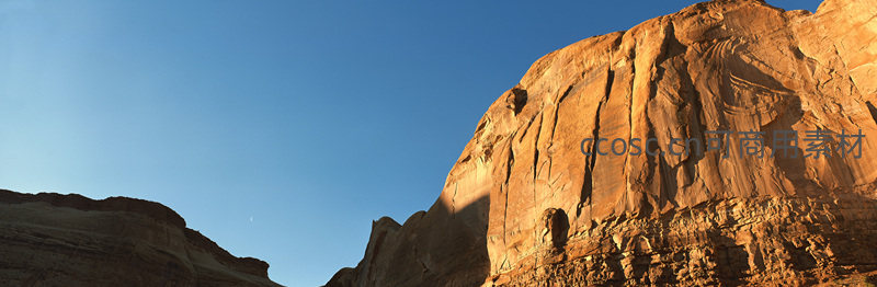 午后阳光斜照在陡峭岩壁上,勾勒出砂岩层层叠叠的肌理与暖色调,蓝天为背景,凸显地质奇观的磅礴与细腻。