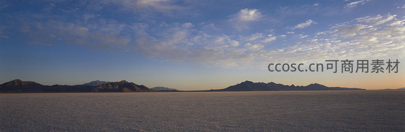 在湛蓝天空和朵朵白云的衬托下,辽阔的盐湖延伸至远方,山峦起伏勾勒天际线,夕阳余晖为大地披上温暖金黄的色彩。