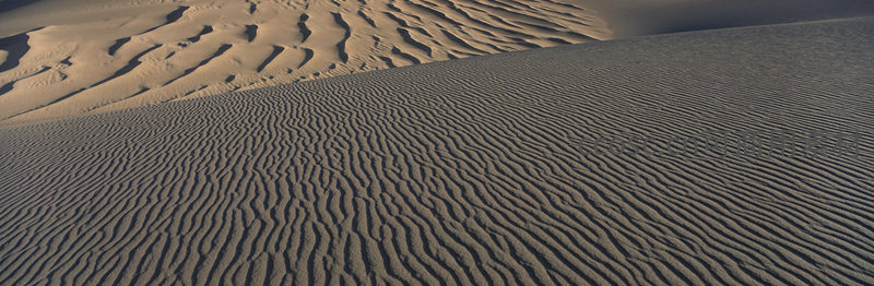 近距离捕捉沙丘表面细密而规律的波纹,阳光斜射勾勒出立体感极强的线条,展示风力雕琢的自然艺术,充满视觉韵律与质感。