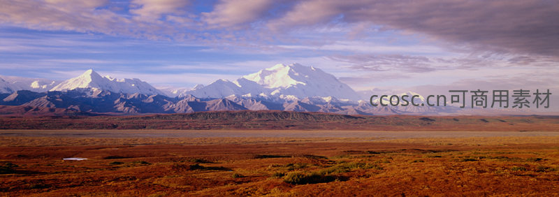 壮丽的雪山巍峨耸立,山脚下是无垠的金黄色草原,天空中云彩变幻,构成一幅宁静而宏大的自然画卷。
