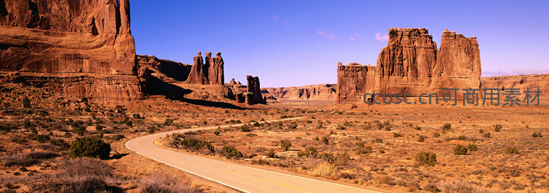 一条笔直的公路穿过广袤的红色岩石峡谷,两旁是高耸的岩壁和稀疏灌木,是探索荒野的理想路线。