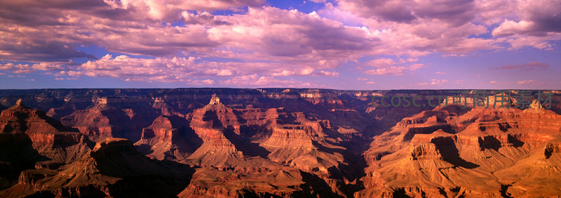 夕阳西下,粉紫色的云彩铺满天际,将大峡谷层层叠叠的红色岩壁染成暖色调,光影交错间尽显地球亿万年雕琢的壮丽与恢弘。