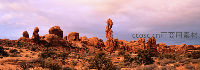 在干燥的沙漠地带,形态各异的风蚀岩柱拔地而起,周围散布着耐旱灌木,天空云层厚重,营造出神秘而苍凉的西部荒野氛围。