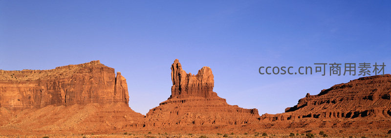 纯净的蓝色天空下,巨大的红色砂岩山峰如巨人般矗立,岩层纹理清晰可见,荒芜的地面点缀着零星绿植,展现原始而雄伟的自然力量。