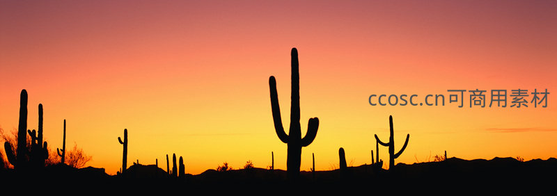广袤沙漠中,高大的仙人掌群在燃烧般的橙红色夕阳下勾勒出清晰剪影,展现荒野生命的坚韧与黄昏的壮美诗意。