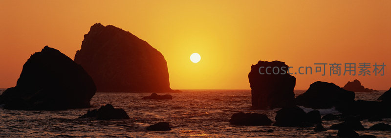 夕阳西下,海面波光粼粼,巨石剪影如画