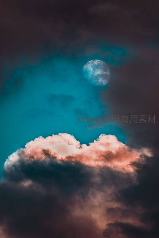 深邃的蓝紫色夜空中,一轮皎洁的满月高悬,下方是被霞光染成粉红的蓬松云朵,营造出神秘而浪漫的氛围。