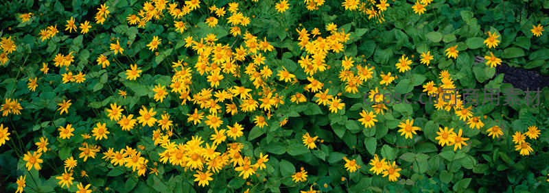 无数朵金黄色的小野菊在翠绿叶片间热烈绽放,形成一片灿烂花海,洋溢着旺盛的生命力和温暖明媚的自然气息。