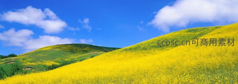 山坡上油菜花如金毯铺展,蓝天白云映衬