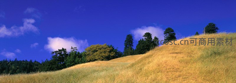 金色草坡与苍翠树林相接,蓝天白云悠然