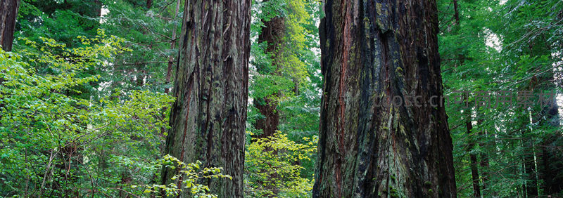 粗壮古老的树干直插云霄,树皮纹理诉说着岁月沧桑,四周绿意葱茏,阳光透过叶隙洒下斑驳光影,静谧而庄严。