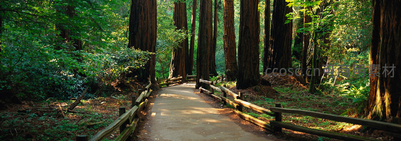 一条铺满落叶的小径穿行于高耸入云的巨木之间,木质护栏沿路延伸,金色阳光穿透树冠洒在路面,充满诗意与宁静。