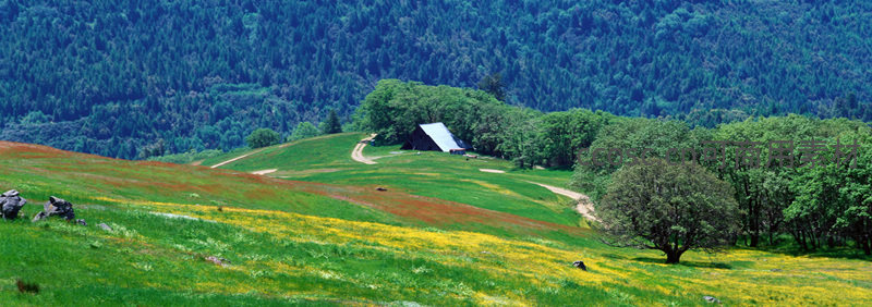 起伏的山坡铺满黄红野花,一座木屋静卧林边,远处青山连绵,蜿蜒小路通向远方,构成一幅远离尘嚣、回归自然的理想田园画卷。