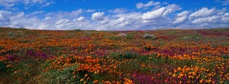 无垠原野被橙红紫各色野花染成斑斓地毯,湛蓝天空飘浮朵朵白云,微风轻拂花浪起伏,呈现出大自然最绚烂奔放的春日生命力。