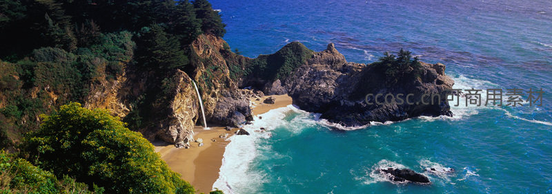 从高空俯瞰,一道细长瀑布自陡峭悬崖直落金沙滩,碧蓝海水环抱嶙峋礁石,形成一处隐秘而梦幻的滨海胜景。