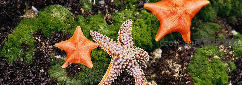三只色彩鲜艳的海星静卧在翠绿苔藓与深色海藻间,纹理清晰,展现潮间带生态的细腻之美。