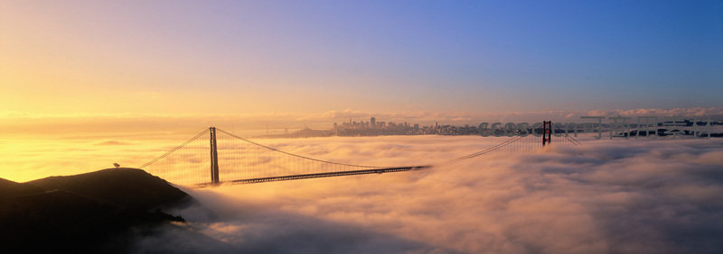 晨曦初露,金门大桥如巨龙般横卧在翻腾的云海之上,远处的城市天际线若隐若现,构成一幅壮丽的都市与自然交融画卷。