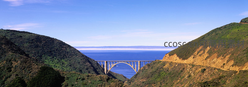 从高处俯瞰,一座优雅的拱桥跨越深谷,将两侧翠绿山峦与蔚蓝大海相连,晴空万里,景色开阔,令人心旷神怡。