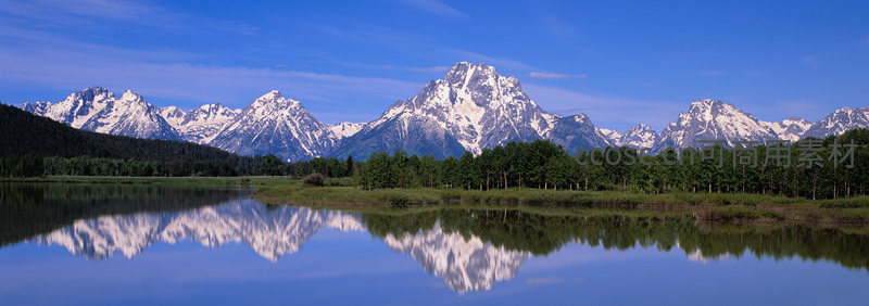 巍峨的雪山在平静如镜的湖面上完美倒映,四周环绕着茂密的绿色森林,蓝天白云相映成趣,营造出极致宁静和谐的自然意境。