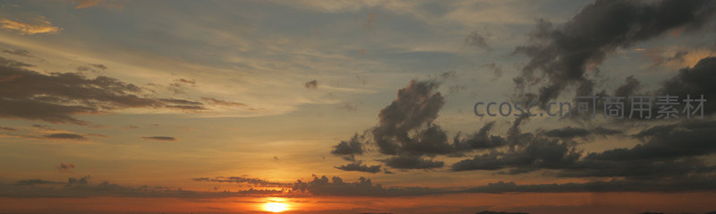 太阳即将隐没地平线,天空被燃烧般的橙红色光芒覆盖,云朵形态各异,在柔和光线中缓缓流动,构成一幅动态画卷。