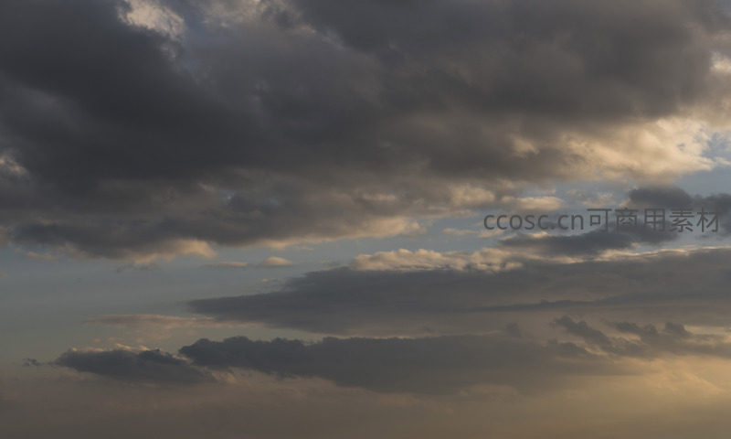 层层叠叠的云朵在黄昏时分被阳光温柔地勾勒出金色轮廓,不同灰度的云层营造出丰富的空间感与宁静致远的意境。