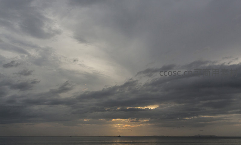 辽阔海面上,薄雾与云层交织,夕阳在地平线处散发柔和光芒,几艘小船点缀其间,尽显天地间的宁静与辽远。