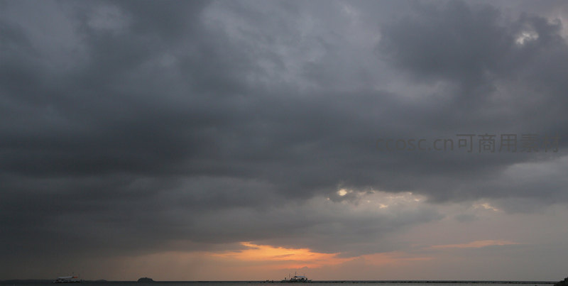 浓重乌云压顶,预示着暴风雨将至,远处海平线上一抹残阳挣扎着透出光芒,几艘孤舟在波涛中若隐若现,充满张力。
