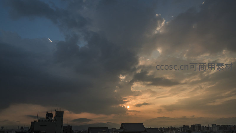 城市的轮廓在落日余晖中若隐若现,现代高楼与传统屋顶并存,厚重的云层间透出温暖的金光,营造出一种既宏伟又宁静的都市黄昏景象。